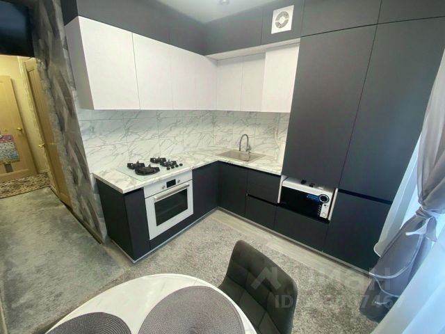 Кухня квадратной формы, в подарок оставляют кухонный гарнитур с подсветкой, есть вытяжка.