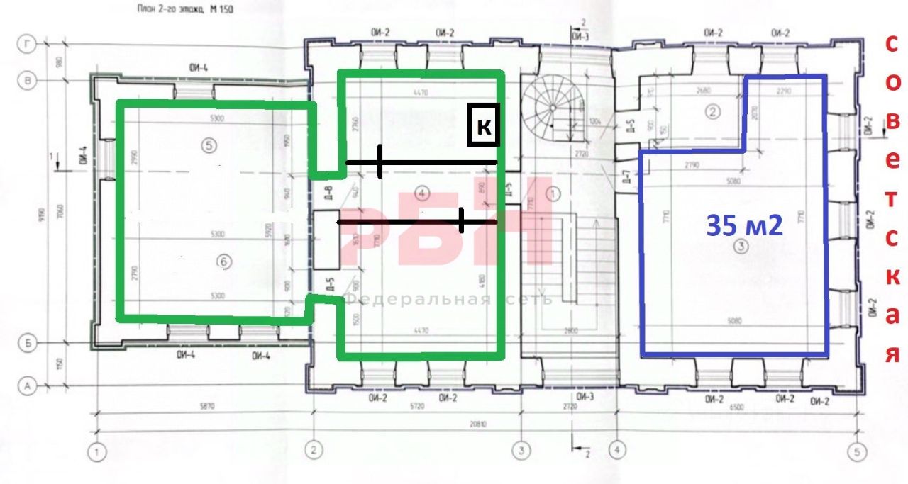 Предлагается в аренду нежилое помещение свободного назначения на 2 этаже общей площадью 35 кв. м. в центральной части города (на плане выделено синим).