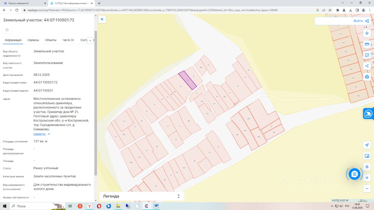 Земельный участок с кадастровым номером 44:07:110501:72, общей площадью 727 кв.м. Местоположение установлено относительно ориентира, расположенного за пределами участка. Ориентир дом 21. Участок находится примерно в 80м по направлению на северо-запад от ориентира. Почтовый адрес ориентира: Костромская обл., р-н Костромской, тер. Середняковское с/п, д.Симаково.