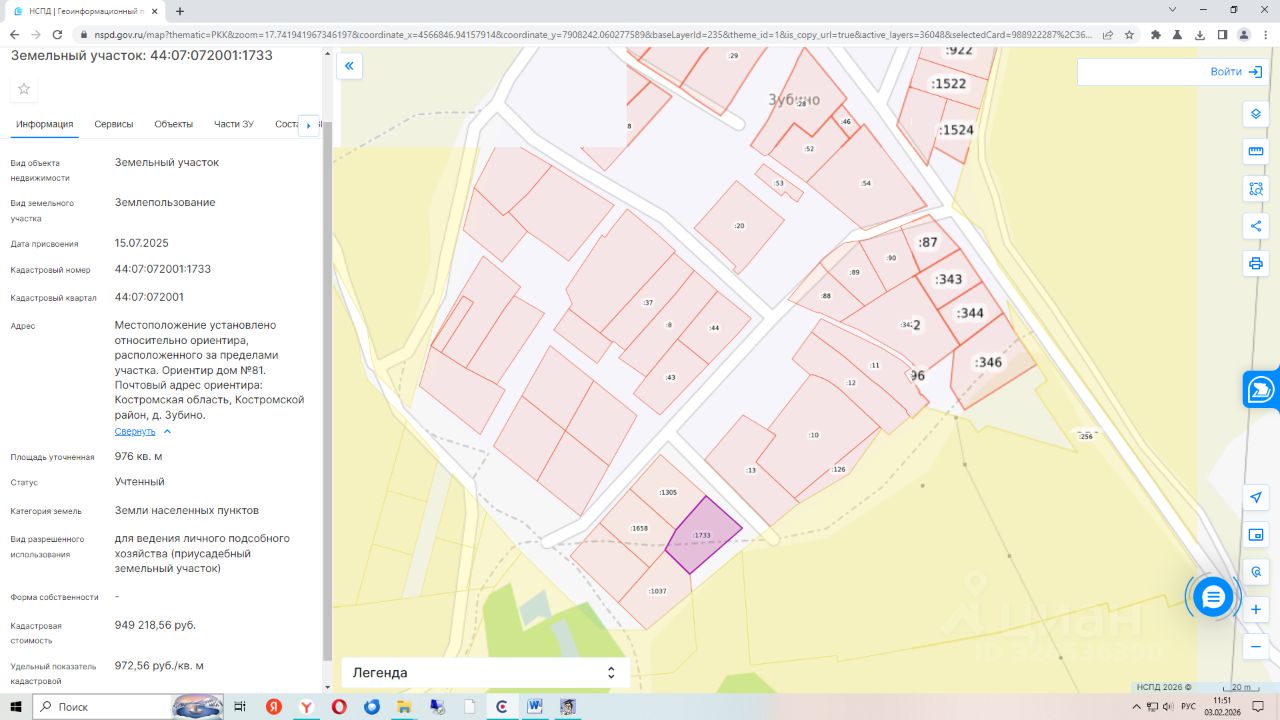 Земельный участок с кадастровым номером 44:07:072001:1733, общей площадью 976 кв.м. Местоположение установлено относительно ориентира, расположенного за пределами участка. Ориентир дом 81, в 11м по направлению на юго-восток. Почтовый адрес ориентира: Костромская область, Костромской район, д. Зубино. Вид разрешенного использования ведение личного подсобного хозяйства (приусадебный земельный участок).