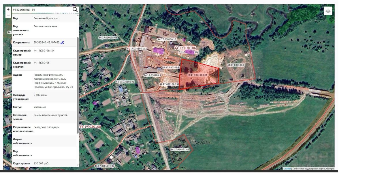 земельный участок с кадастровым номером 44:17:030106:134 площадью 9400 кв.м., из категории земель "земли населенных пунктов".