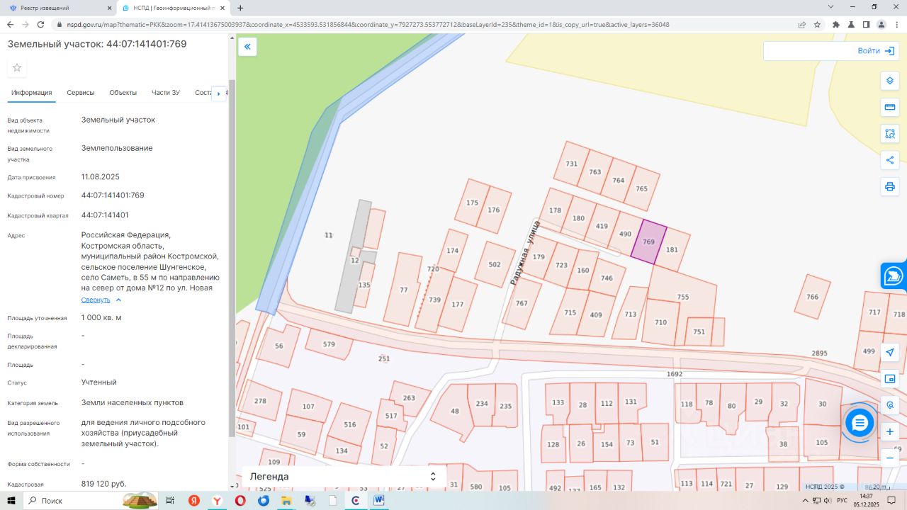 Земельный участок с кадастровым номером 44:07:141401:769, общей площадью 1000 кв.м., расположенного по адресу: Российская Федерация, Костромская область, муниципальный район Костромской, сельское поселение Шунгенское, село Саметь, в 55м по направлению на север от дома 12 по ул. Новая. Вид разрешенного использования для ведения личного подсобного хозяйства (приусадебный земельный участок). Категория земель земли населенных пунктов.