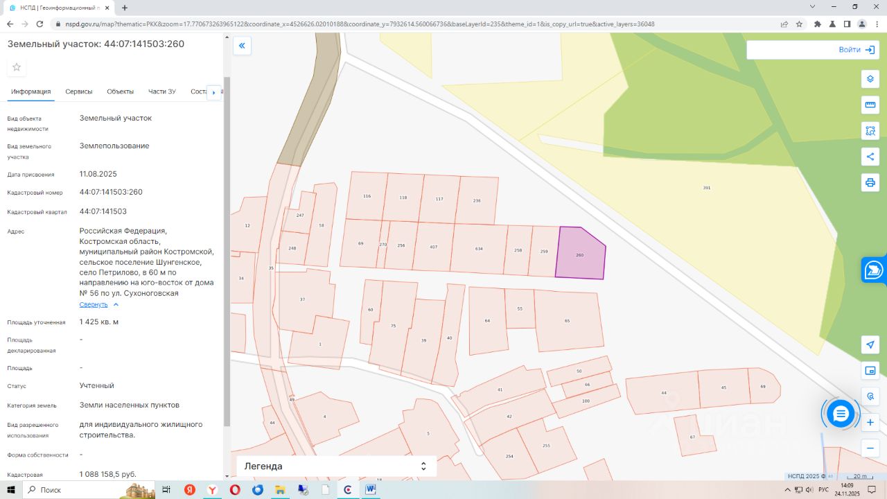 Земельный участок с кадастровым номером 44:07:141503:260, общей площадью 1425 кв.м., расположенного по адресу: Российская Федерация, Костромская область, муниципальный район Костромской, сельское поселение Шунгенское, село Петрилово, в 60м по направлению на юго-восток от дома 56 по ул. Сухоноговская. Вид разрешенного использования для индивидуального жилищного строительства. Категория земель земли населенных пунктов.