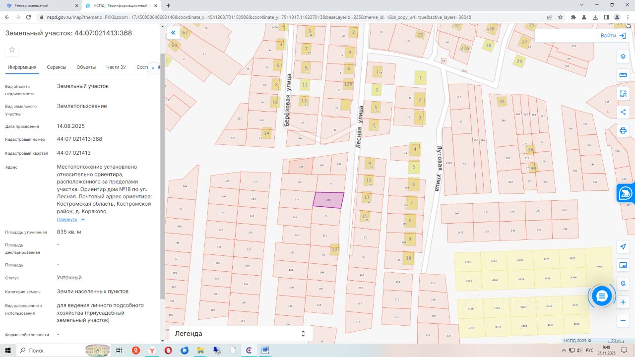 Земельный участок с кадастровым номером 44:07:021413:368, общей площадью 835 кв.м. Местоположение установлено относительно ориентира, расположенного за пределами участка. Ориентир дом 18 по ул. Лесная, в 3м по направлению на север. Почтовый адрес ориентира: Костромская область, Костромской район, д. Коряково. Вид разрешенного использования ведение личного подсобного хозяйства (приусадебный земельный участок).