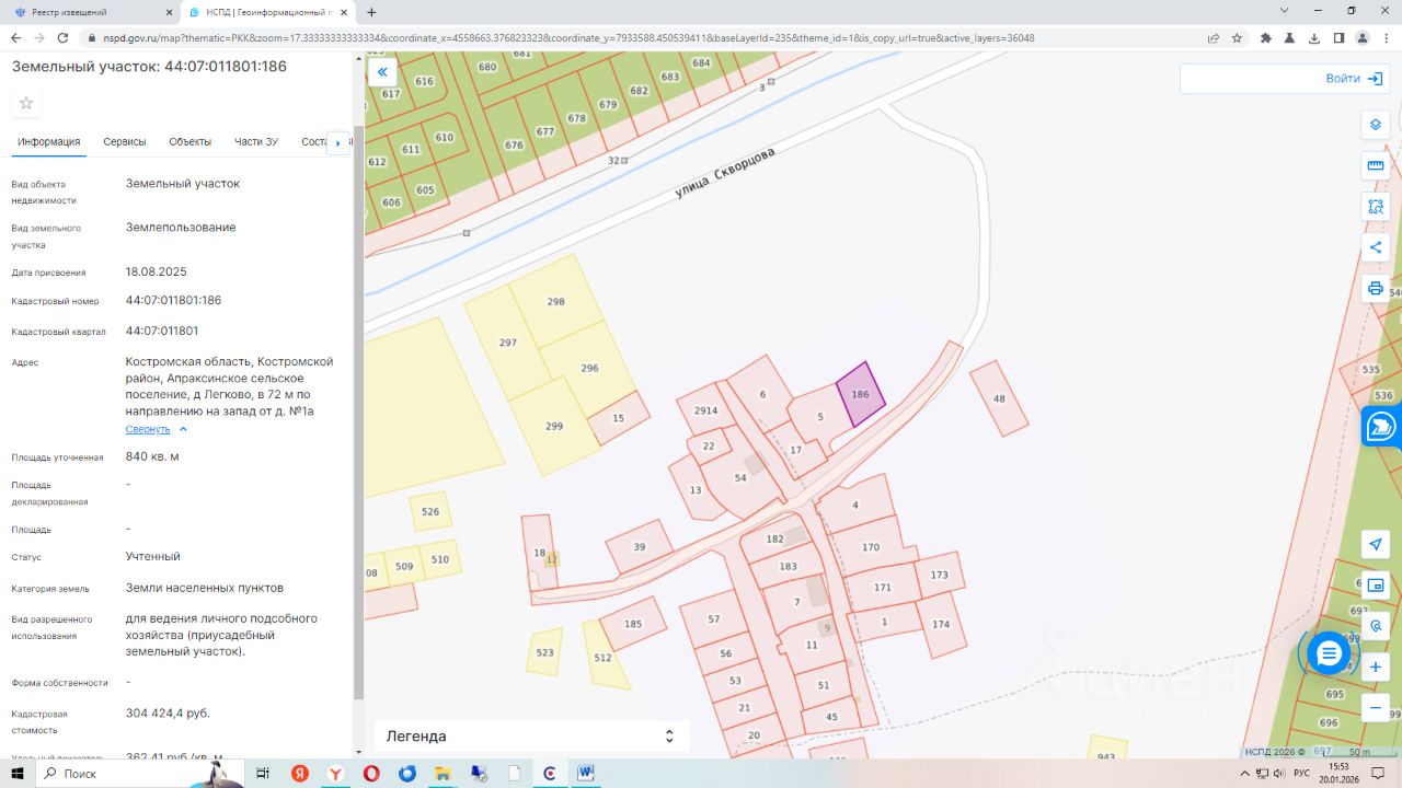 Земельный участок с кадастровым номером 44:07:011801:186, общей площадью 840 кв.м., расположенного по адресу: Костромская область, Костромской район, Апраксинское сельское поселение, д. Легково, в 72м по направлению на запад от д. 1а. Вид разрешенного использования для ведения личного подсобного хозяйства (приусадебный земельный участок). Категория земель земли населенных пунктов.