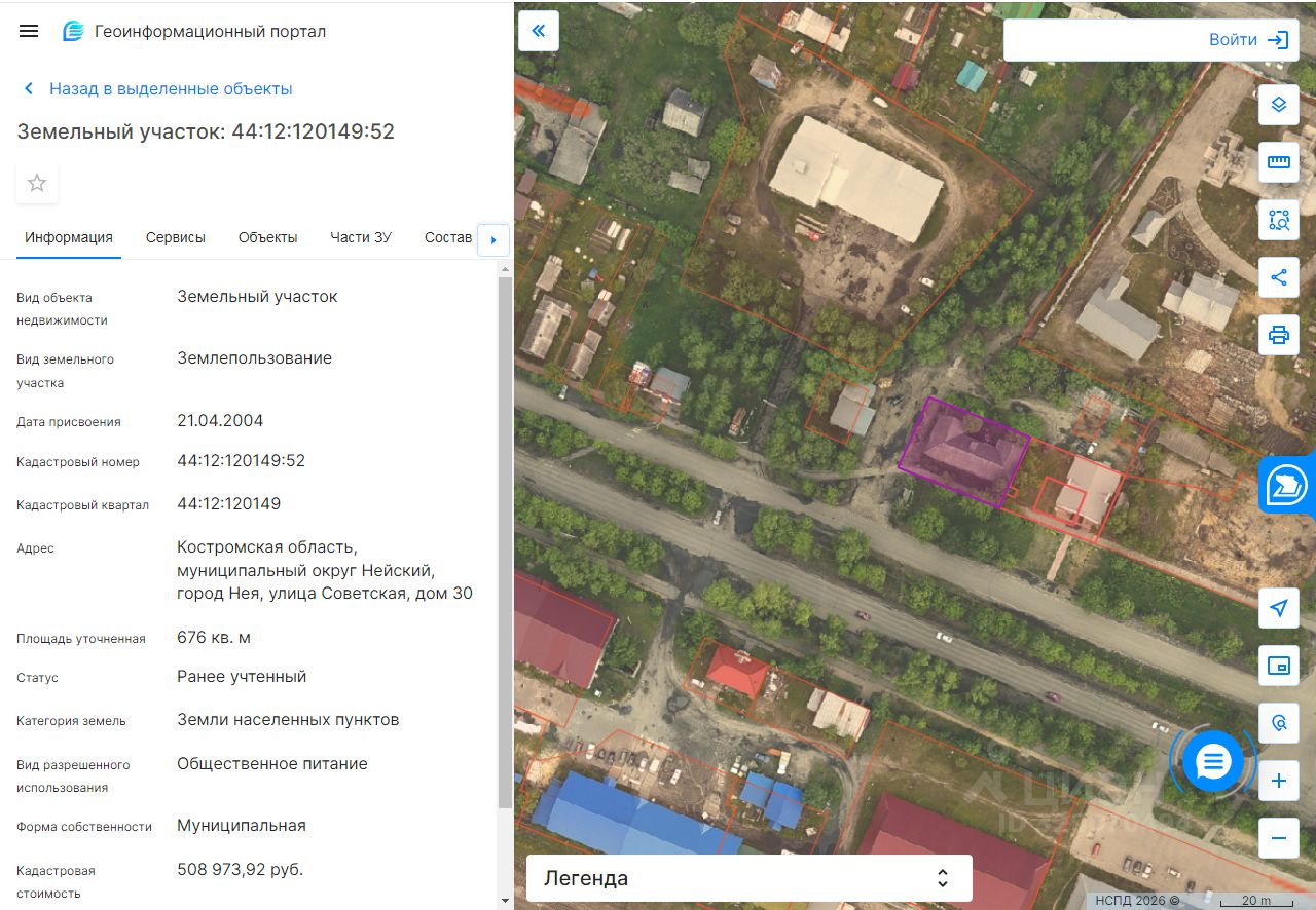 Право на заключение договора аренды земельного участка с кадастровым 44:12:120149:52 площадью 676,0 кв.м., местоположение: Костромская область, муниципальный округ Нейский, город Нея, улица Советская, дом 30, категория земель: земли населённых пунктов, вид разрешенного использования общественное питание