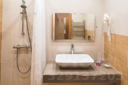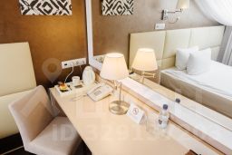 Номер выполнен в спокойной бежево-коричневой гамме. Оборудование номера гарантирует комфортное пребывание:кровать шириной 140см,кондиционер,письменный стол,телевизор с плоским экраном,холодильник,чайная станция.В ванной комнате:фен,полотенца,махровый халат,минипарфюмерия