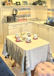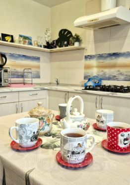 В комнате на первом этаже кухонный уголок с газовой плитой (можно использовать как кухню-столовую). В комнатах небольшие холодильники, электрические чайники, микроволновки, посуда. А также стиральная машина, фен, утюг.