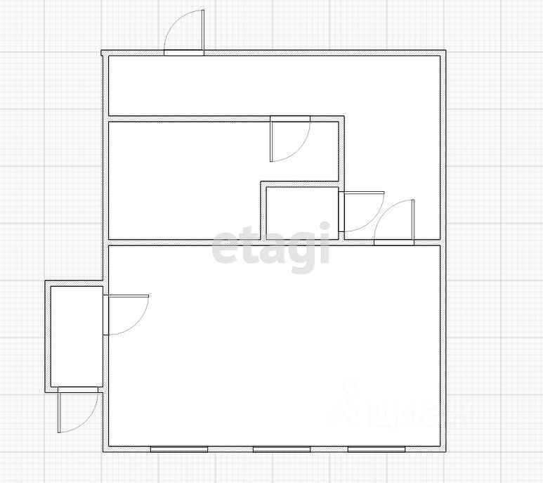 Помещение поделено на зоны: большая зона при входе, отдельно санузел, еще помещение с газовым котлом (можно использовать под склад), два длинных коридора.