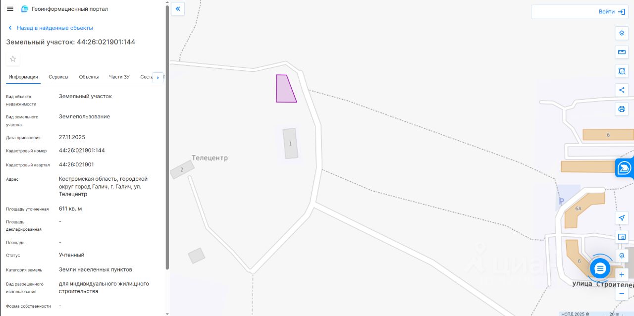 Земельный участок (право собственности) с кадастровым номером 44:26:021901:144, площадью 611 кв. м, адрес (местоположение): Российская Федерация, Костромская область, г.о. город Галич, г. Галич, ул. Телецентр. Целевое назначение земельного участка — для индивидуального жилищного строительства