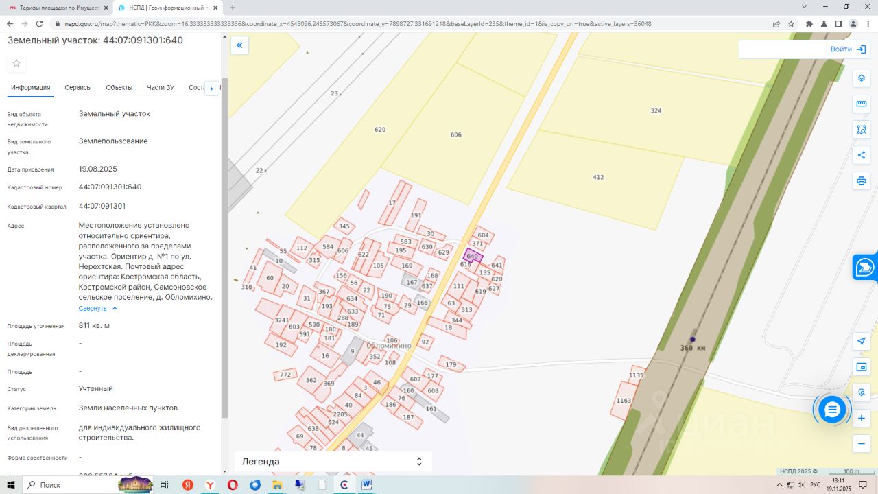 Земельный участок с кадастровым номером 44:07:091301:640, общей площадью 811 кв.м. Местоположение установлено относительно ориентира, расположенного за пределами участка. Ориентир д.1 по ул. Нерехтская, в 15м по направлению на юго-запад. Почтовый адрес ориентира: Костромская область, Костромской район, Самсоновское сельское поселение д. Обломихино. Вид разрешенного использования для индивидуального жилищного строительства. Категория земель земли населенных пунктов.