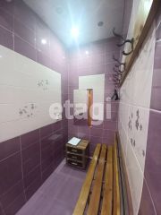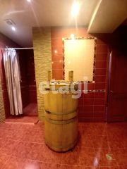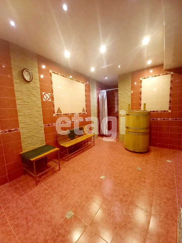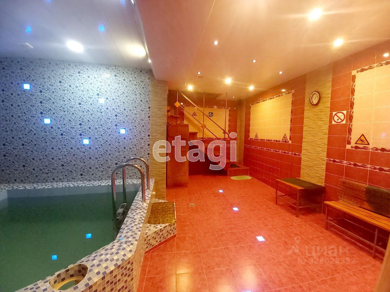 В основном зале бассейн емкостью 7 куб. м. с подсветкой, все помещение в зале на 1 этаже выложено плиткой, укладывали самостоятельно, полы с подогревом. Достаточно просторная сауна на 6 человек. В зале рабочая кедровая бочка, душ, с/у.