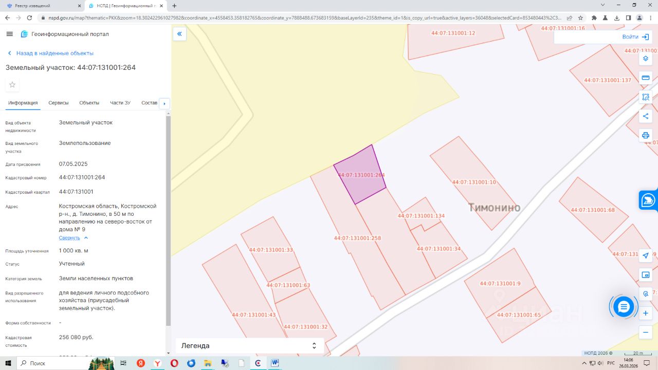 Земельный участок с кадастровым номером 44:07:131001:264, общей площадью 1000 кв.м, расположенного по адресу: Костромская область, Костромской р-н, д. Тимонино, в 50м по направлению на северо-восток от дома 9. Вид разрешенного использования для ведения личного подсобного хозяйства (приусадебный земельный участок). Категория земель земли населенных пунктов.