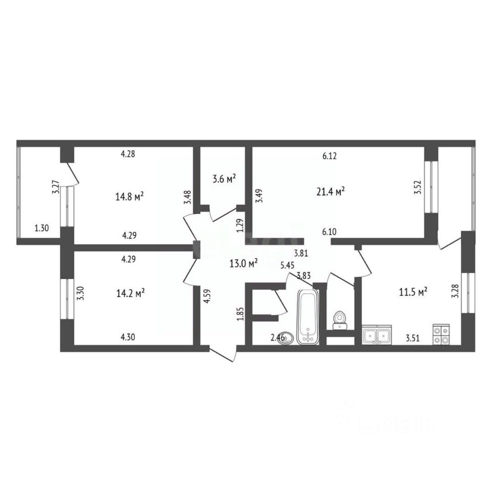 Общая площадь квартиры с учетом лоджий составляет 96,6 кв.м.