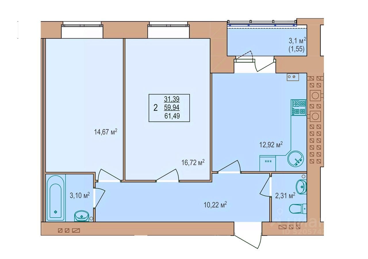 2-комн. квартира, 61,49 м²