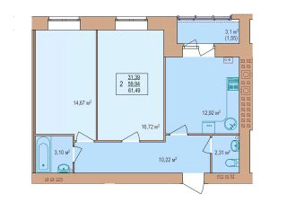 2-комн. квартира, 61,49 м²