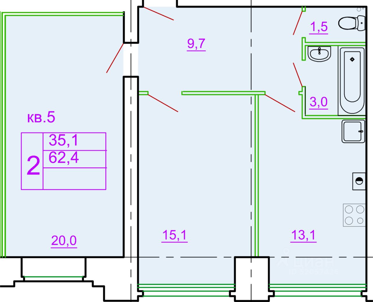 2-комн. квартира, 62,4 м²