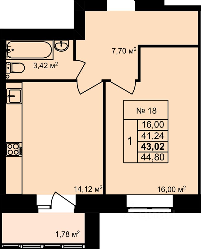 1-комн. квартира, 41,24 м²