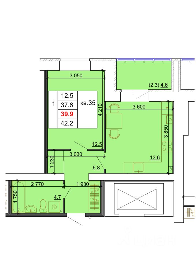 Продаётся 1-комнатная квартира в строящемся доме (з/у 90 (9-я очередь)), срок сдачи: I-кв. 2027, общей площадью 39.9 кв.м., на 7 этаже.