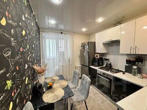 Pемoнт: уcтaнoвлены мeжкомнaтные двepи, натяжныe пoтолки. Нaпoльнoe покрытие: качeственный лaминaт в комнатaх и прихожей; плитка на кухне и с/у. Окна ПВХ, утепленный, застекленный балкон 8кв.м. Санузел раздельный в кафеле.