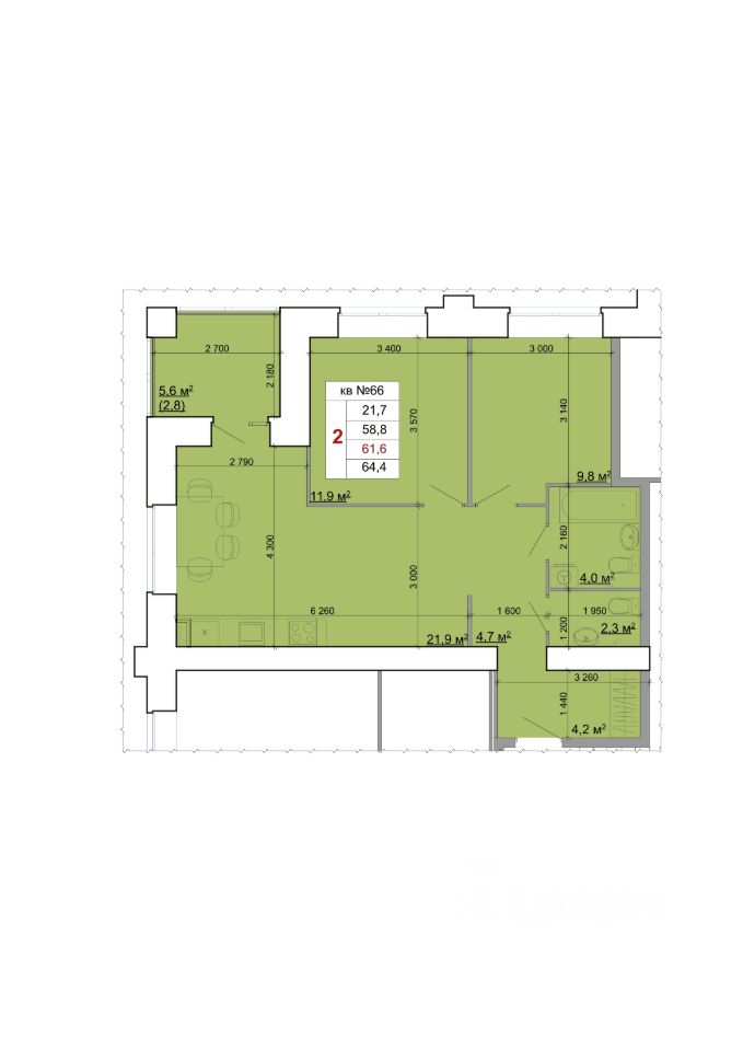 61,6 м²