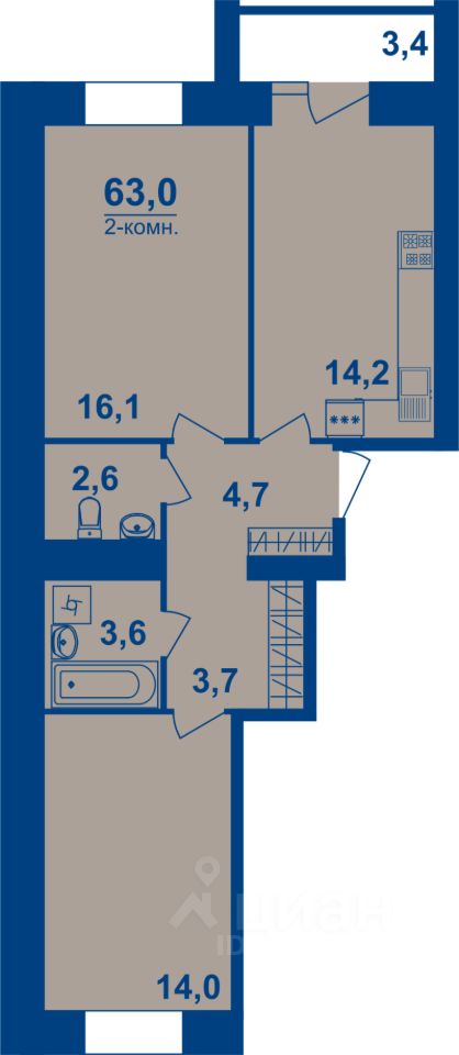 2-комн. квартира, 63 м²