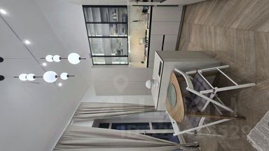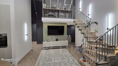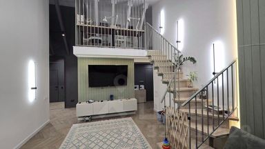 Панорамные окна, теплые подоконники. Балкон с панорамным остеклением, проведен теплый пол. Очень много различных световых зон. Дорогой кухонный гарнитур со встроенной варочной поверхностью, духовым шкафом, посудомоечной машиной, винным шкафом, микроволновкой и холодильником. Есть отдельное помещение для мытья собаки. Можно его переоборудовать в санузел. В комнатах потолки доходят до 5.2 метров. Отдельно сделан кабинет на 2 этаже в кухне-гостиной. Полы везде, кроме спален - плитка. В спальнях ламинат. По мебели которая остается в стоимость квартиры уточняйте по телефону. Торг при определённых условиях.