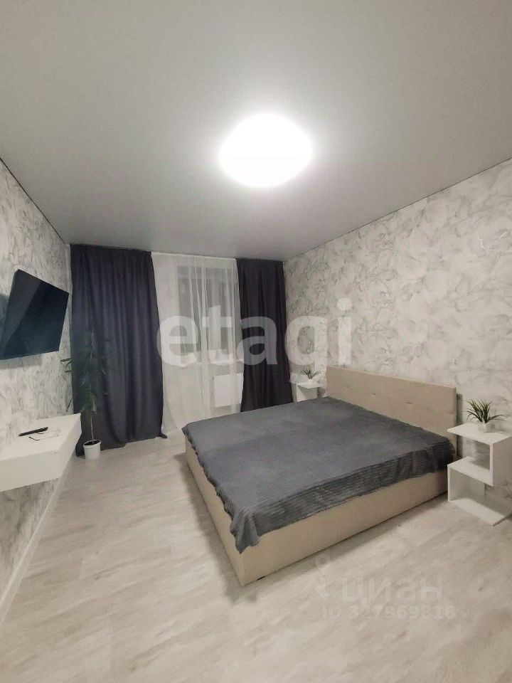 В комнате 2-х спальная кровать (160 см) с ортопедическим матрасом. Прикроватные тумбы. Телевизор с встроенной "Алиса". Вместительный шкаф-купе.