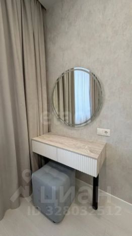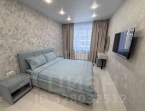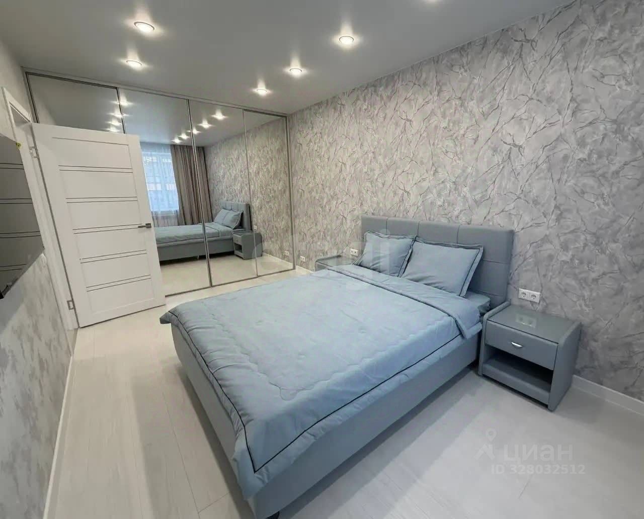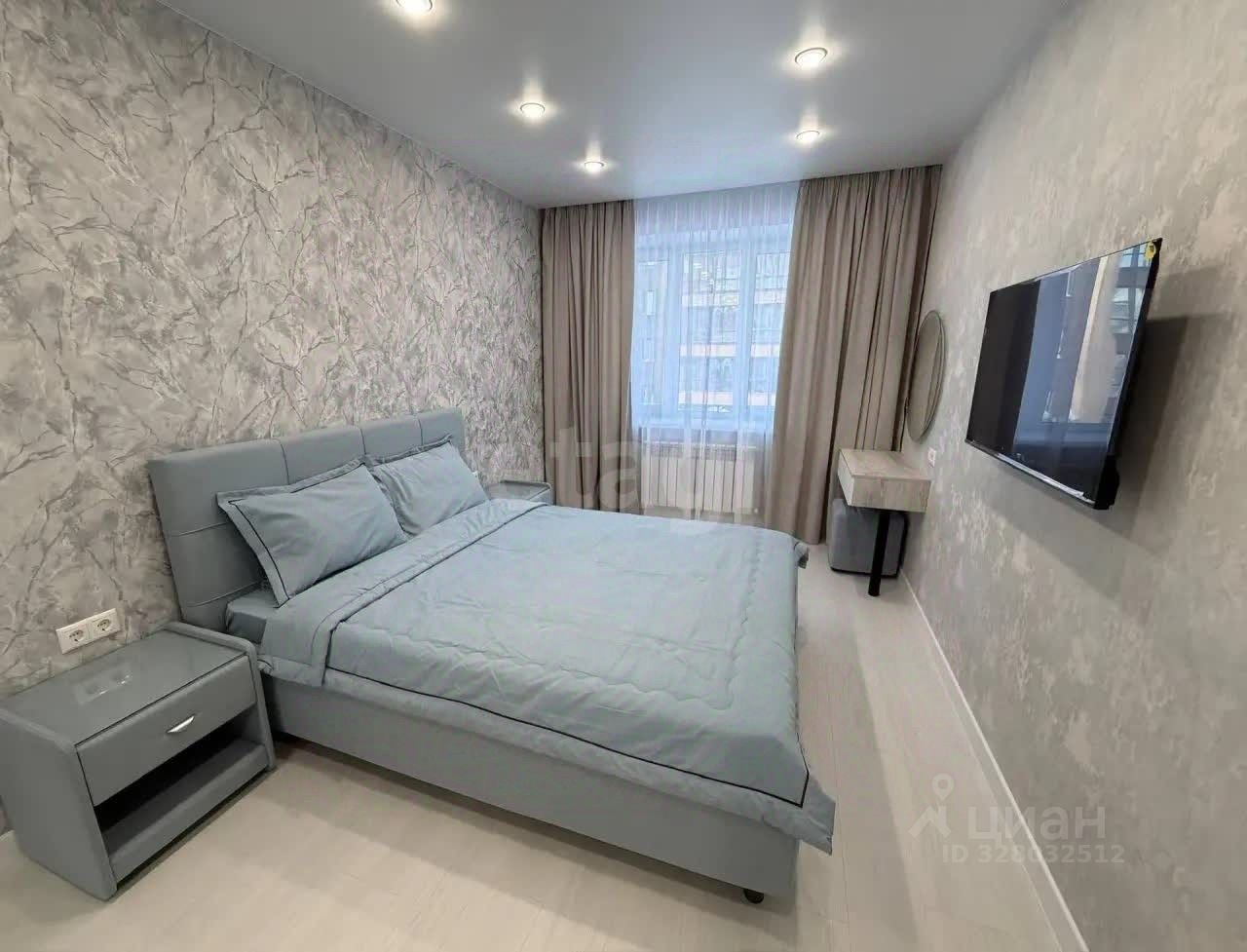 В квартире светлая спальня с кроватью и ортопедическим матрасом. Имеется встроенный большой шкаф-гардеробная, оборудованный изнутри полками, штангами и ящиками для удобного хранения.Так же консоль, 2 тумбочки по краям кровати,телевизор.