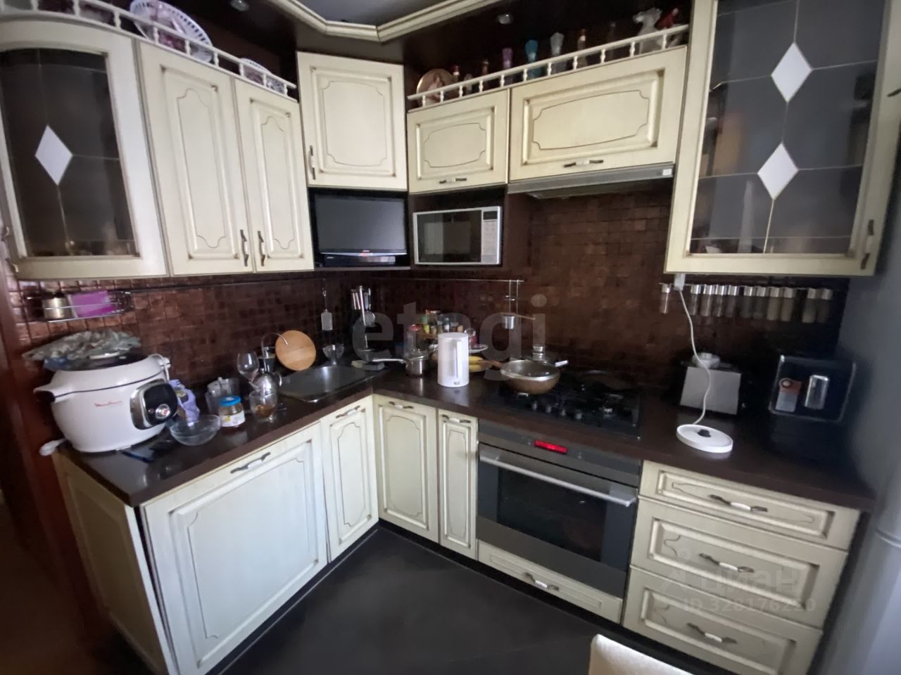 Кухня площадью 7,5 м2 выложена плиткой и оборудована кухонным гарнитуpом с встрoенной теxникoй: вaрочная поверхность, вытяжка, посудомоечная машинка.