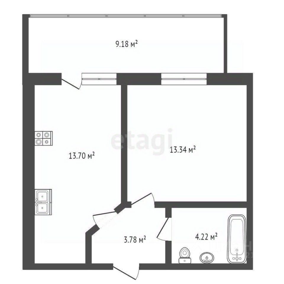 Квартира с просторной лоджией 9,1 кв.м., санузел совмещенный.