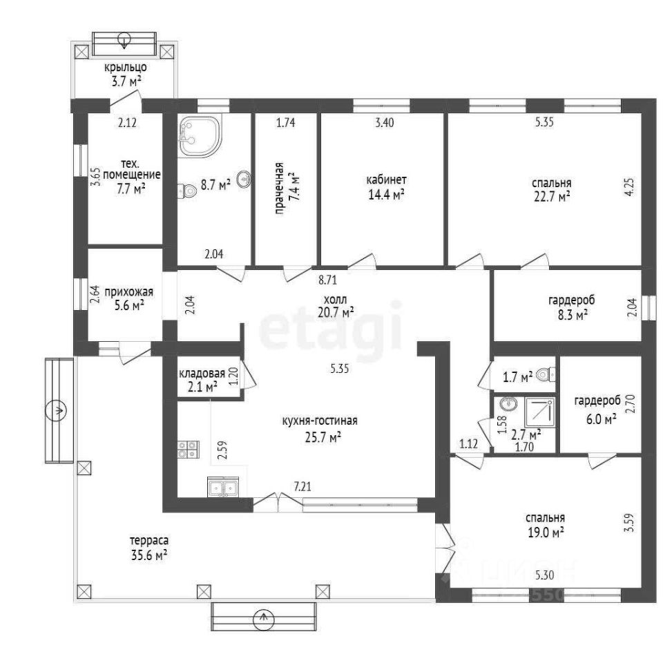 Сан. узел на 1 этаже 8,7 м² + душевая 2,7 м²** удобство для большой семьи.
