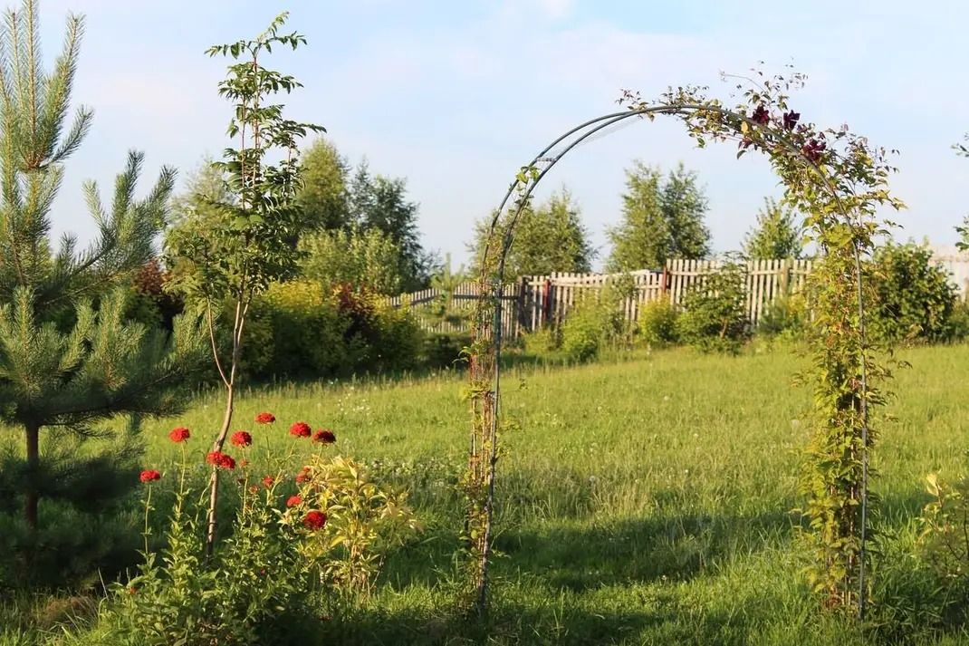 По периметру участка деревянный забор и живая изгородь из боярышника и сосен.