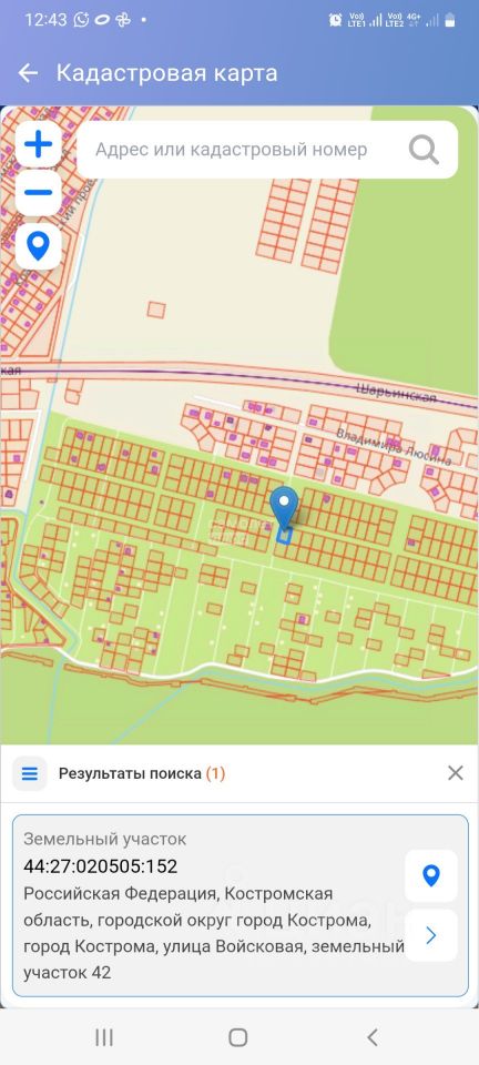 Участок 8 соток ИЖС, подходит для строительства частного жилого дома. Адрес: ул.Войсковая, участок 42. Кадастровый номер 44:27:020505:152. На месте участок огорожен сигнальной лентой.