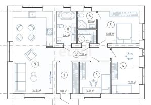 Планировка отличается продуманностью и функциональностью: просторная кухня-гостиная служит центром семейной жизни, три изолированные комнаты обеспечивают уединение, а одна из них обустроена как мастер-спальня. Дополнительные преимущества включают просторный санузел и отдельную гардеробную комнату.