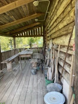 Дом стоит на ленточном фундаменте из красного кирпича. Первый этаж бревно, второй мансардный. Окна и двери деревянные.Крыша покрыта ондулином.