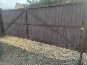 Забор. Столбы 60*60, заполнены бетоном, прожила 40*20. Три стороны металл оцинковка С8. Высота 1,8м. Лицевая сторона С8 коричневый. Калитка, откатные ворота.
