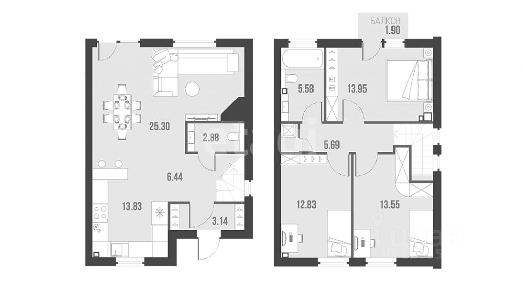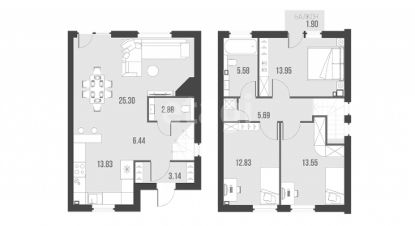 1 этаж: Просторная кухня (18 м²), 2 светлые комнаты, санузел (ванна + душ), прихожая.