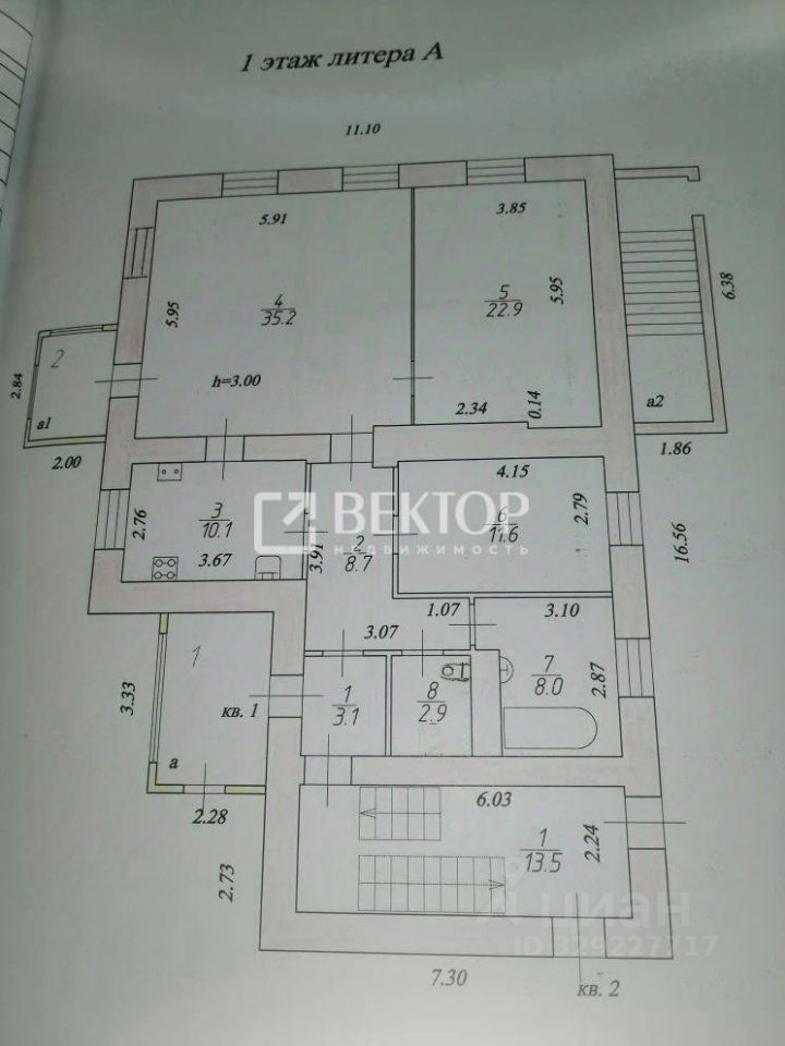 Продаётся первый этаж двухэтажного дома с отдельным входом (выделен в квартиру), общей площадью 160 м. Площадь первого этажа - 114,2 м. Здесь расположены три комнаты (35,2 м, 22,9 м, 11,6 м), кухня (10,1 м), ванная (8,0 м), раздельный туалет, прихожая, коридор и две пристройки.